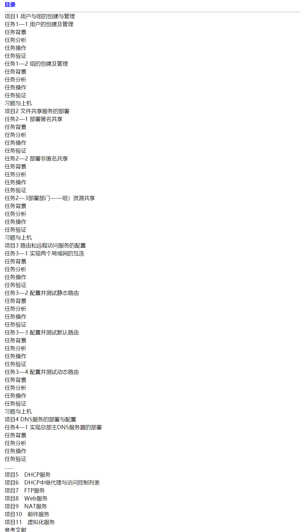 资源围绕网络管理员、网络工程师等岗位对Windows服务管理核心技术技能的要求,基于工作过程系统化方法,包系统统安装、管理信息中心的用户和组、部署生产部局域网、部署企业的邮件服务等11个项目,场景化的还原企业实际项目和业务流程。每个项目都按企业工作实际分解为若干个工作任务,系统讲述了Windows Server 2012系统的安装、用户管理等工作任务实施所需的相关理论与实践,通过项目背景、项目分析、项目相关知识为子任务做铺垫,任务实施过程中由任务说明、任务分析、任务操作和任务验证构成,符合工程项目实施的一般规律。