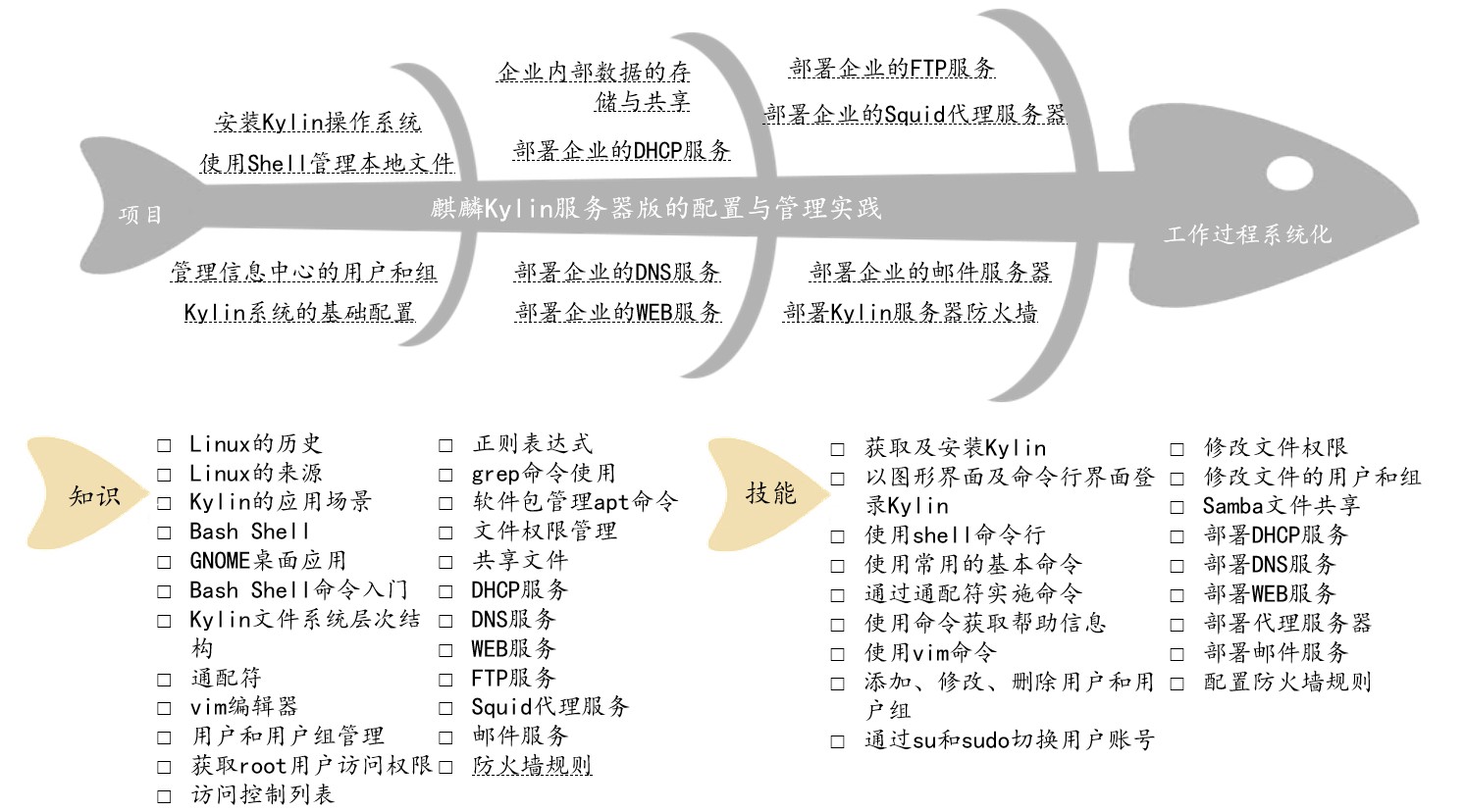 银河麒麟服务器版课程资源包可用于《银河麒麟服务器操作系统》的课程教学,涉及知识点和技能点包括但不限于Kylin简介、shell、Bash、目录结构、文件系统、VIM编辑器、用户语族、SSHD远程登录、网络简介、安全策略、软件源、文件权限、磁盘管理、SAMBA服务、DHCP服务、DNS服务、WEB服务、FTP服务、代理服务器、邮件服务器、防火墙、NAT转换等,按“项目引领、任务驱动”的体例,系统讲述了Kylin服务器操作系统安装、服务搭建等工作任务实施所需的相关理论与实践,帮助学生快速掌握Kylin服务器操作系统。