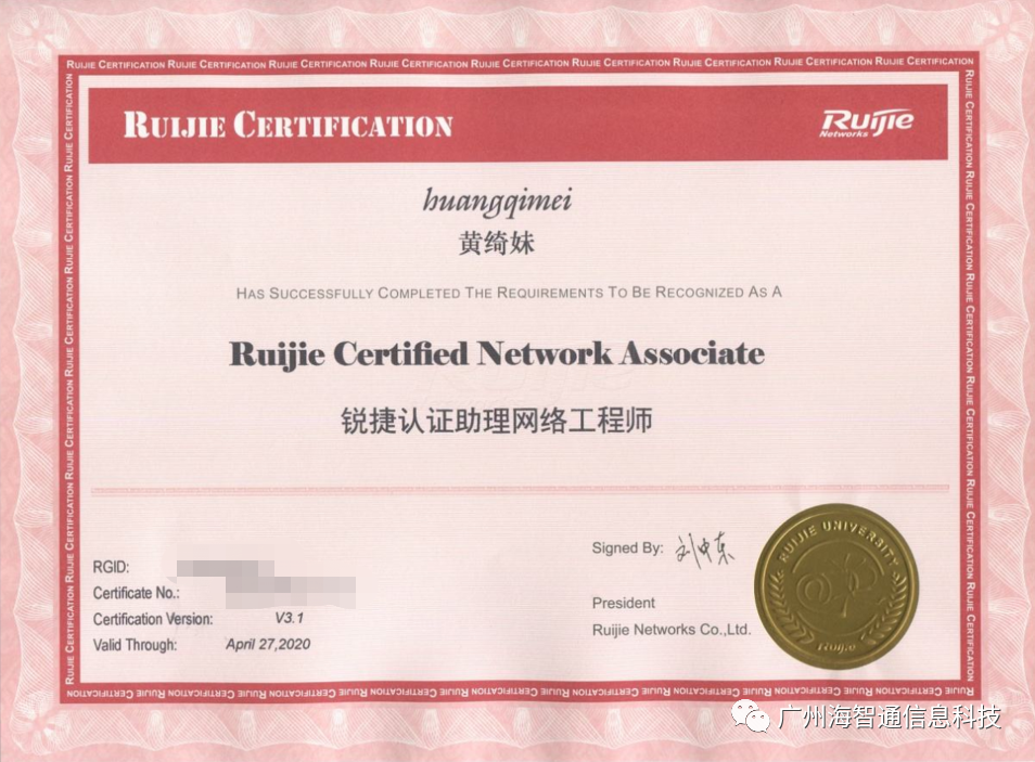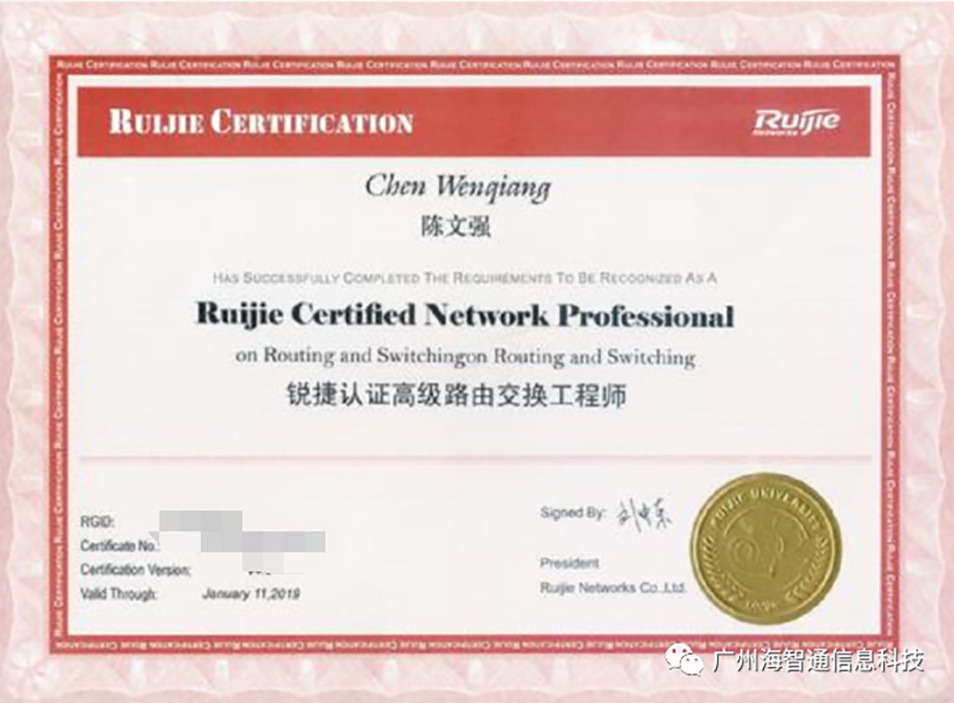 锐捷认证是IT领域的网络专业技能认证,拥有锐捷认证资格的人士将具有专业的网络知识和网络技能,并具有在特定的技术、领域或者职业岗位的专业能力,并且能为他们的雇主带来巨大的价值和回报。锐捷认证体系包括职业认证、专项认证、行业认证、师资认证。